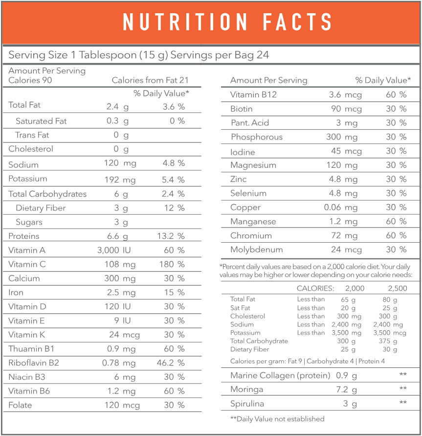 Ingredients: Moringa, Spirulina, Maca, Chlorella, Blue berry, Acaí berry, Elderberry, Blackberry, Vitamins, Amino acids, Fiber, Probiotics and prebiotics.